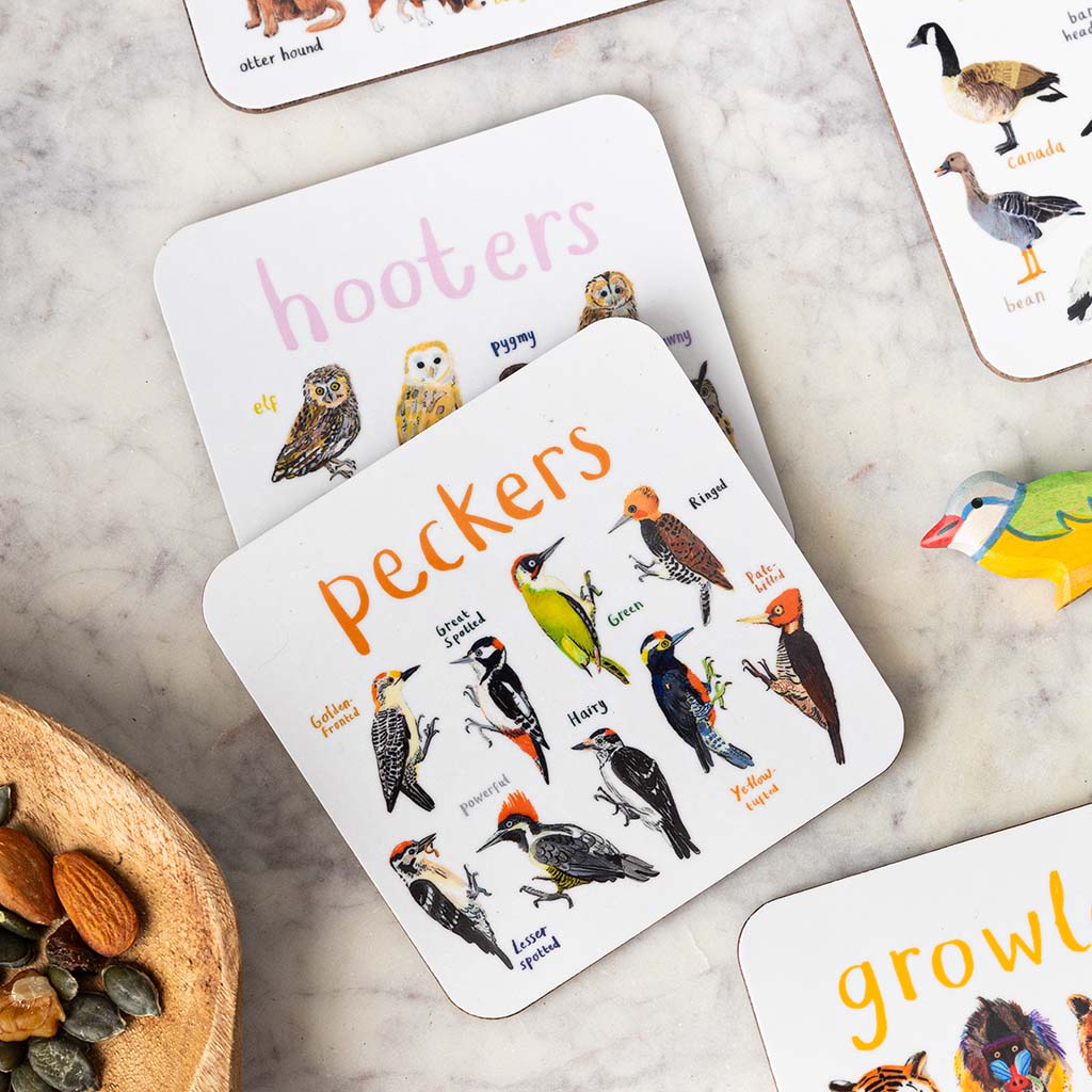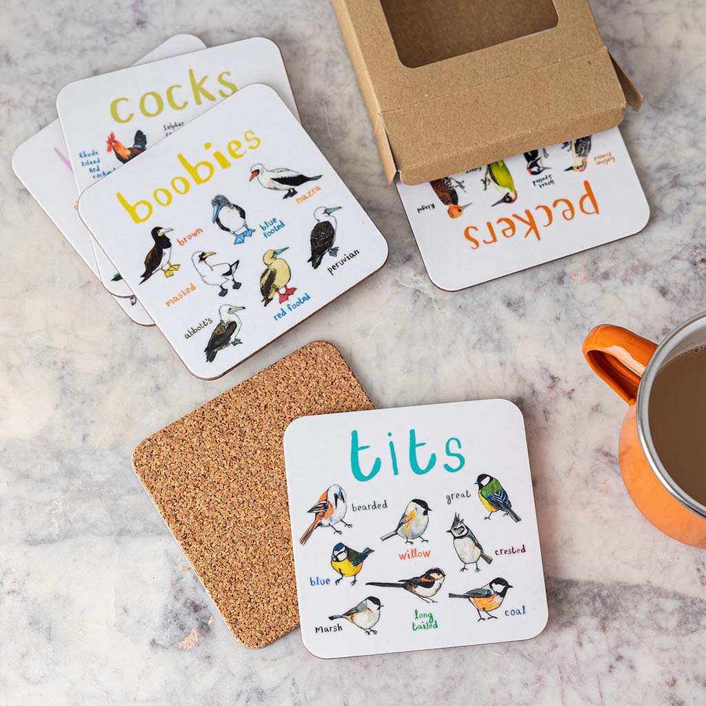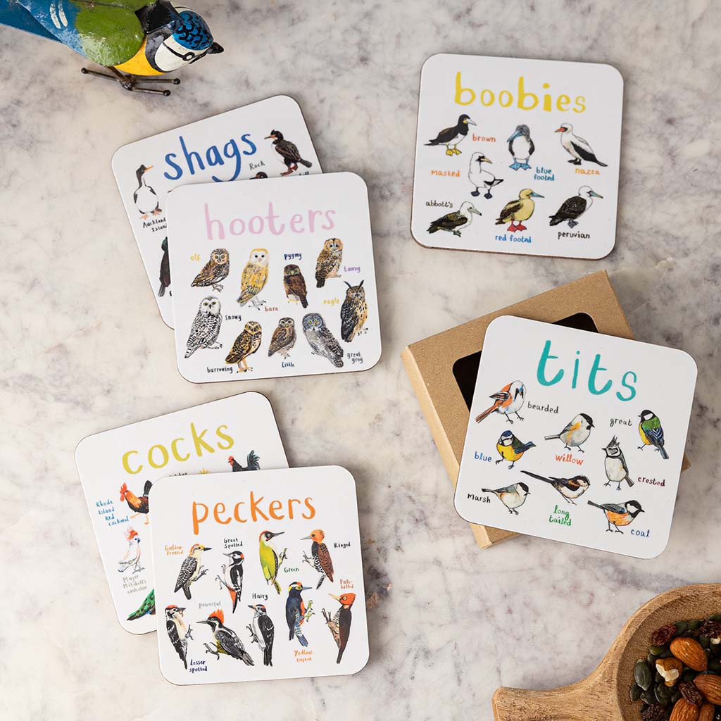 A collection of 6 Bird Pun Coasters, each featuring a different bird chart from the best selling ‘For the Pun of It’ collection. This listing is for one of each coaster - Tits, Boobies, Cocks, Shags, Peckers and Hooters. The designs are cheeky and educational in equal measures, with each hand illustrated bird being named with Sarah’s signature typography.