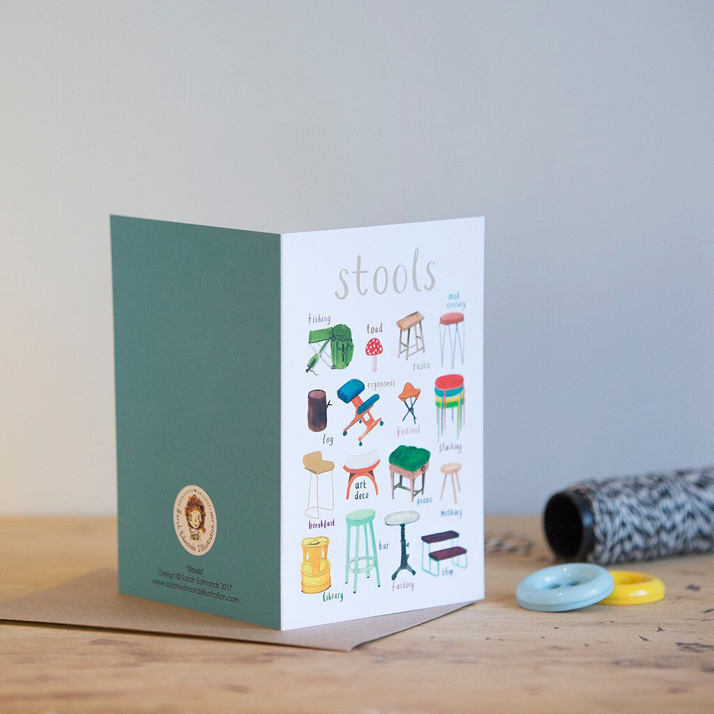 The Stools card shows a brightly illustrated chart of stylish and functional seating. The different stools featured range from fishing and dining to piano and festival perches, and have all been drawn separately by hand then brought together digitally with Sarah’s signature typography.